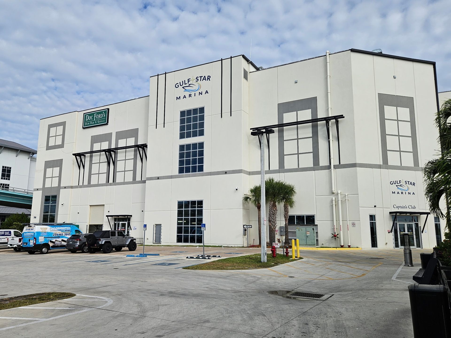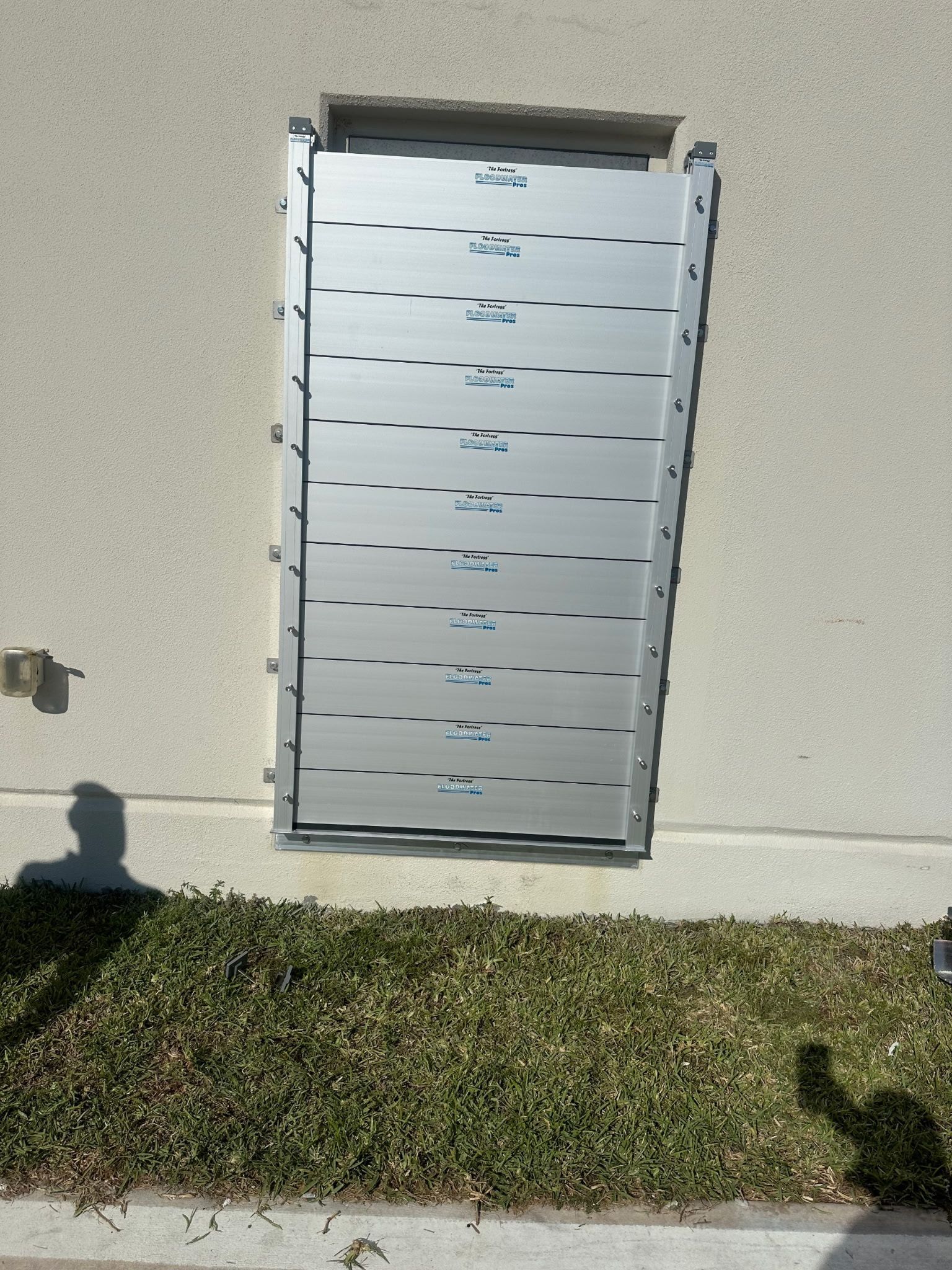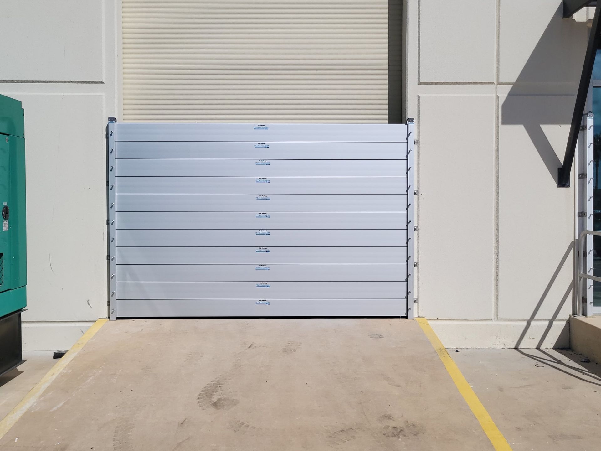 A white flood barrier is sitting on the sidewalk in front of a building.